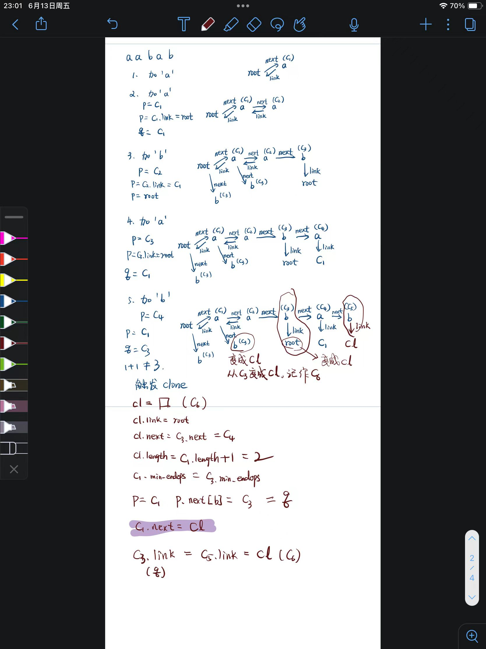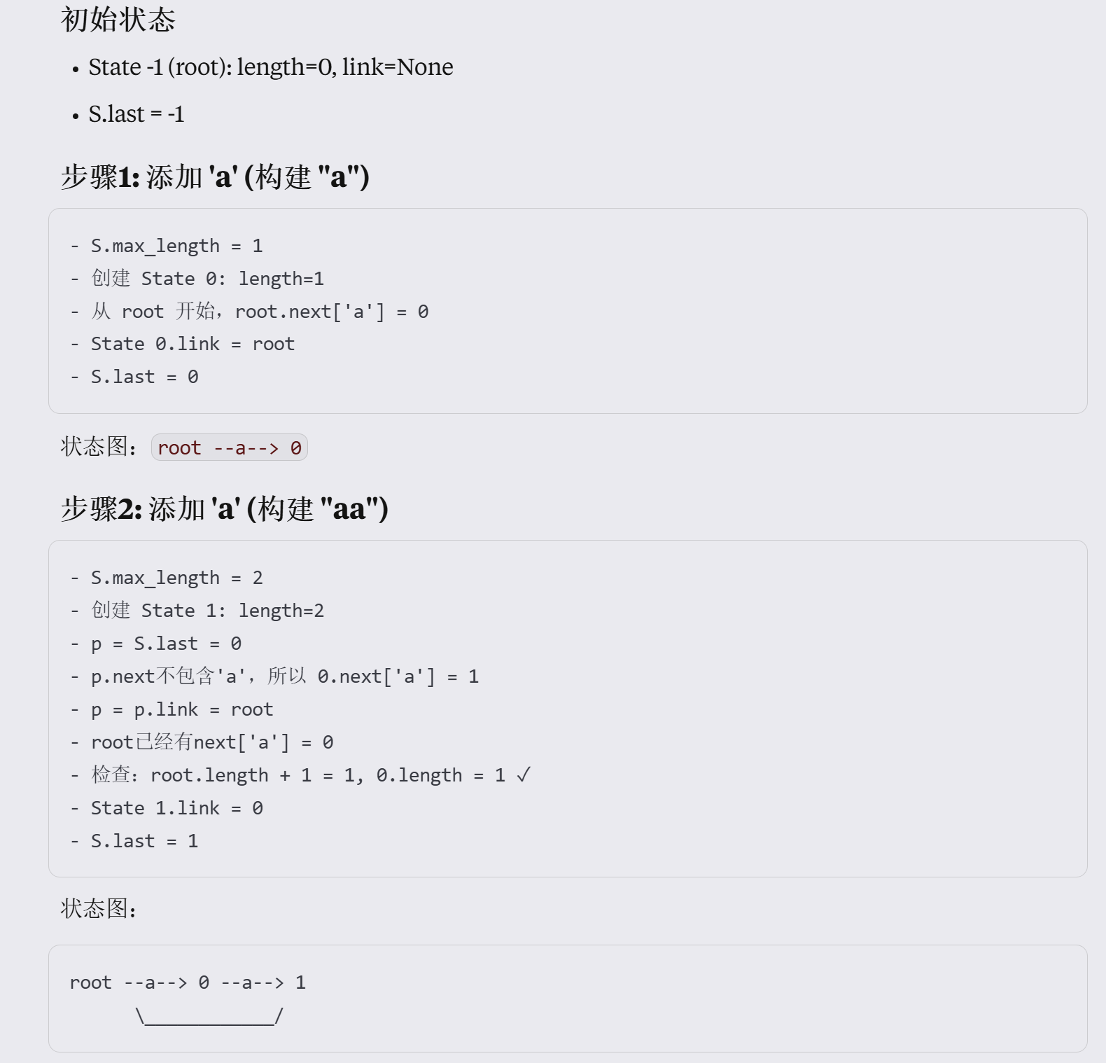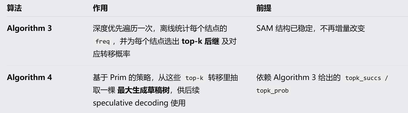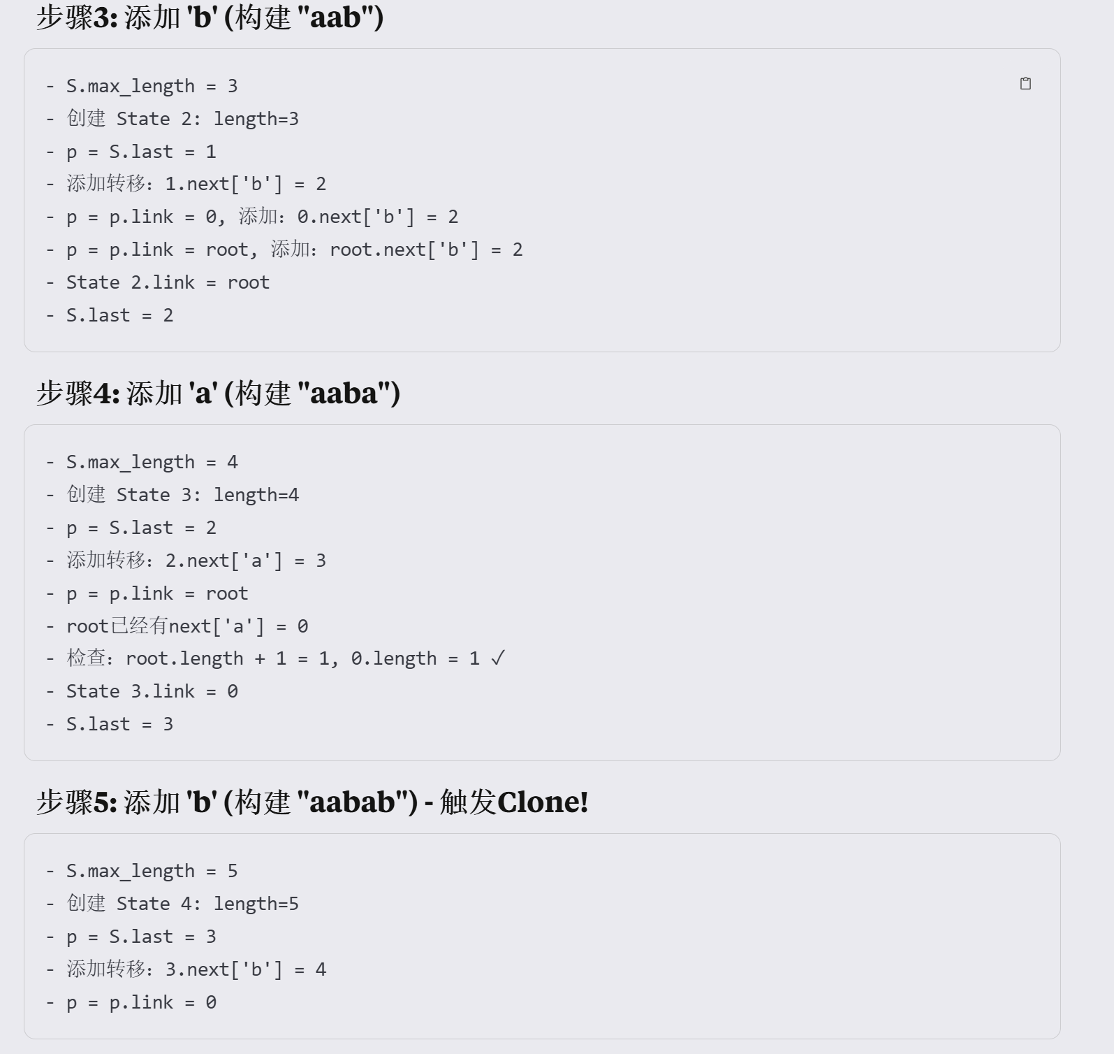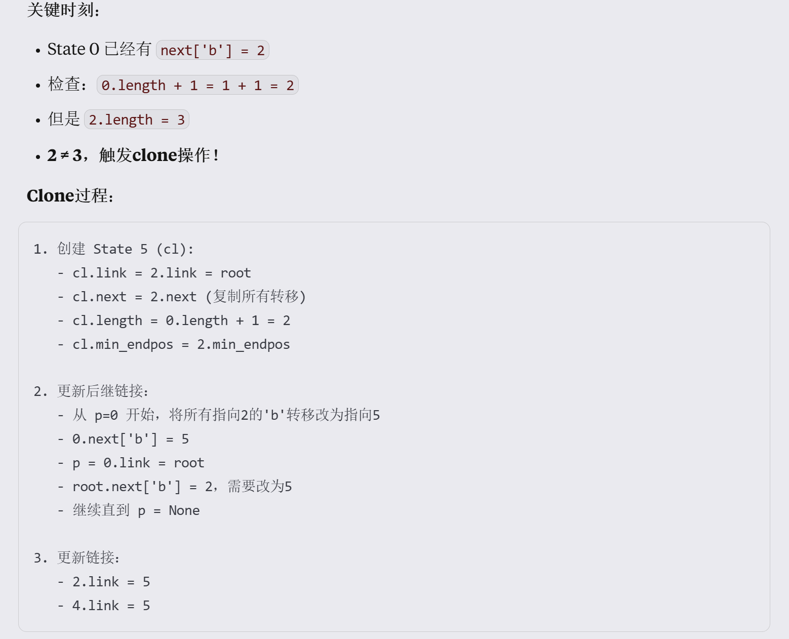 列举了一个sam的Suffix Automaton构建 中命中clone的推导(不懂这个算法为什么这么设计 但是你别管,follow别人就行),算法1讲解了Suffix Automaton的状态转移算法,论文里实际上只有一套 Suffix Automaton(SAM)的增量构建算法2,也就是说离线构建的静态也是这套,只是在推理的时候不会再expand了。