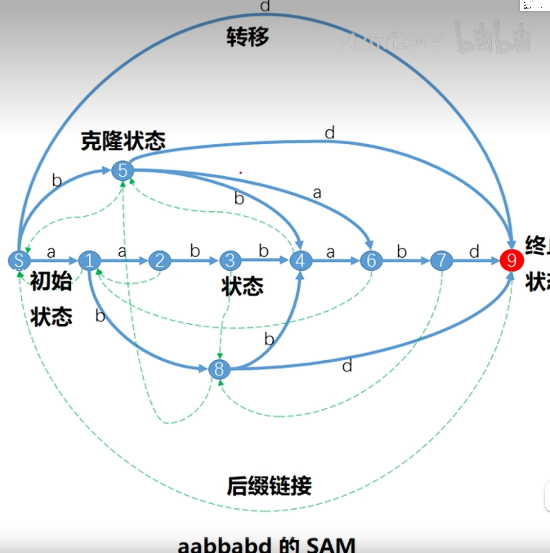 ##- link:指向当前状态所代表子串的最长真后缀对应的状态